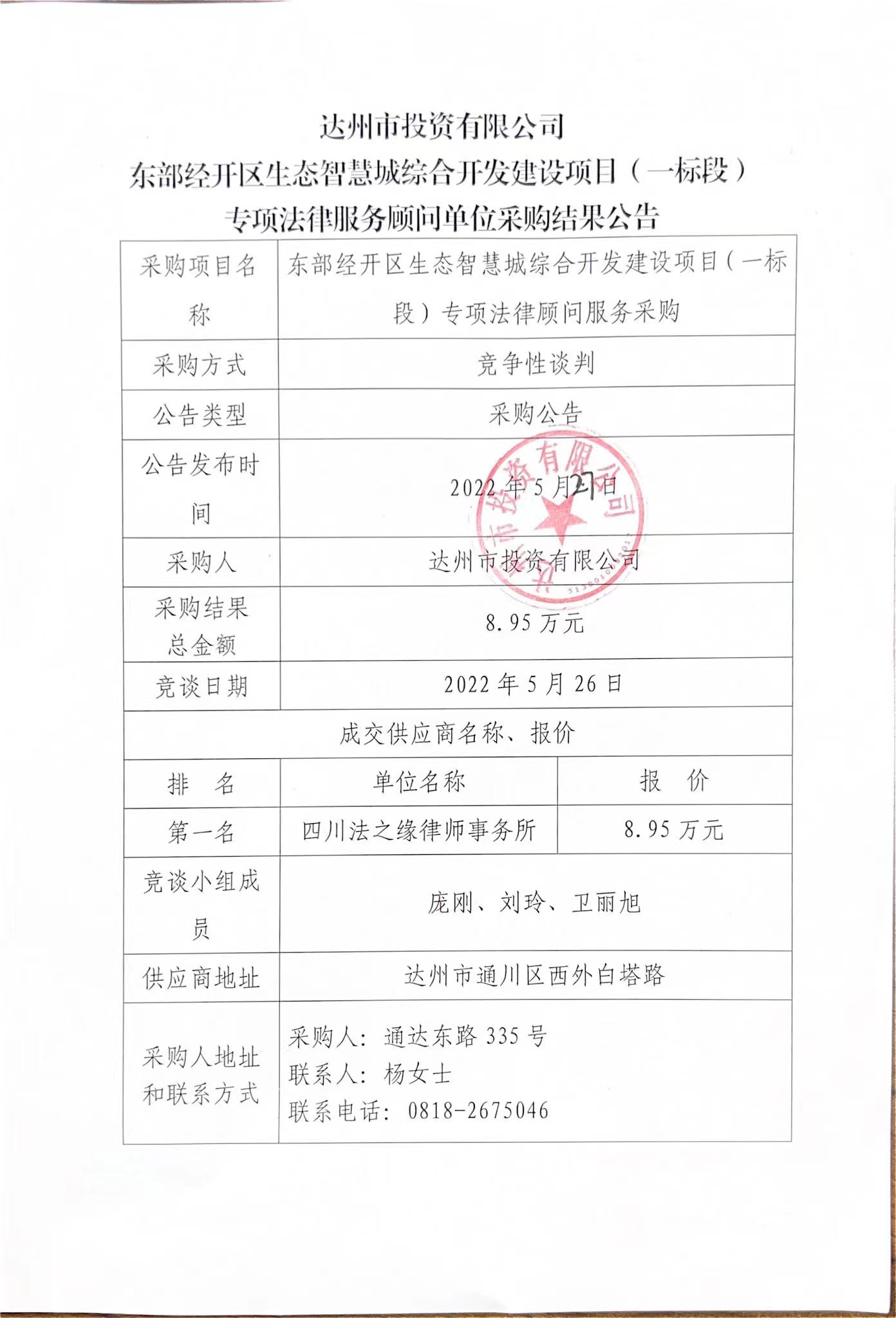 東部經開區生態智慧城綜合開發建設項目(一標段)專項法律服務顧問單位采購結果公告