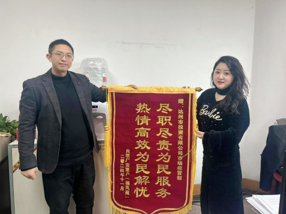 11月19日,原肉聯廠安置房住戶將一面寫著“盡職盡責為民服務 熱情高效為民解憂”的錦旗送到市投資公司,感謝公司圓了他們17年的“安居夢”。